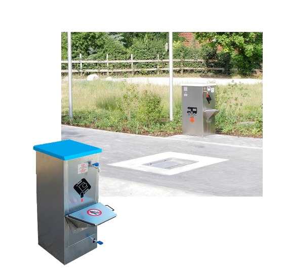 Fäkalienentsorgung für Wohnmobilstellplätze mit zusätzlich überfahrbarer Wanne für Grauwasser